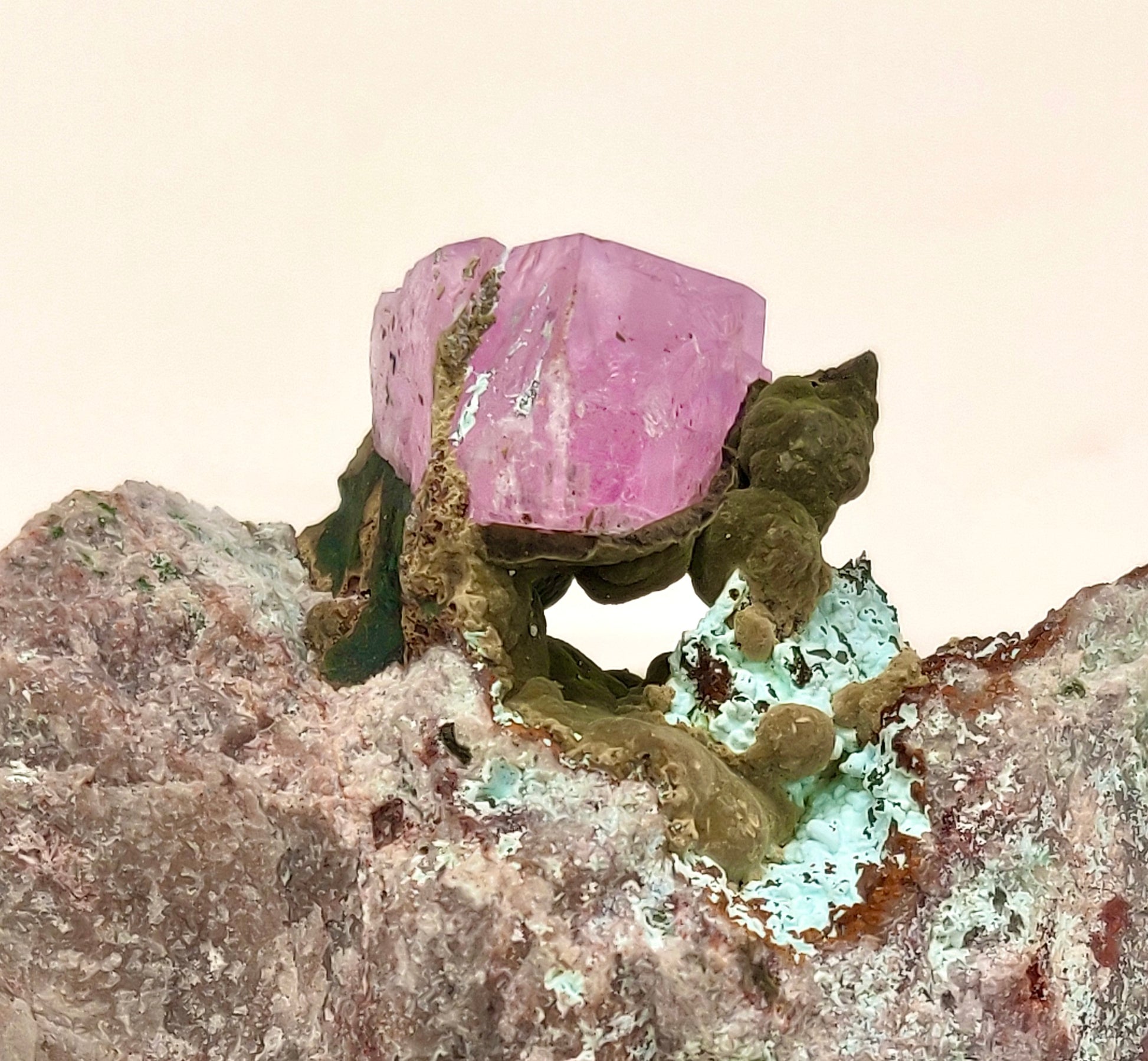 - Matrix: Olive-green Kolwezite aggregates with pale blue-green Chrysocolla accents ("Full Suite" association)