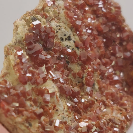 Characteristics: Sharp hexagonal crystal forms; brilliant sub-adamantine luster; deep red-orange saturation; natural contrasting matrix.